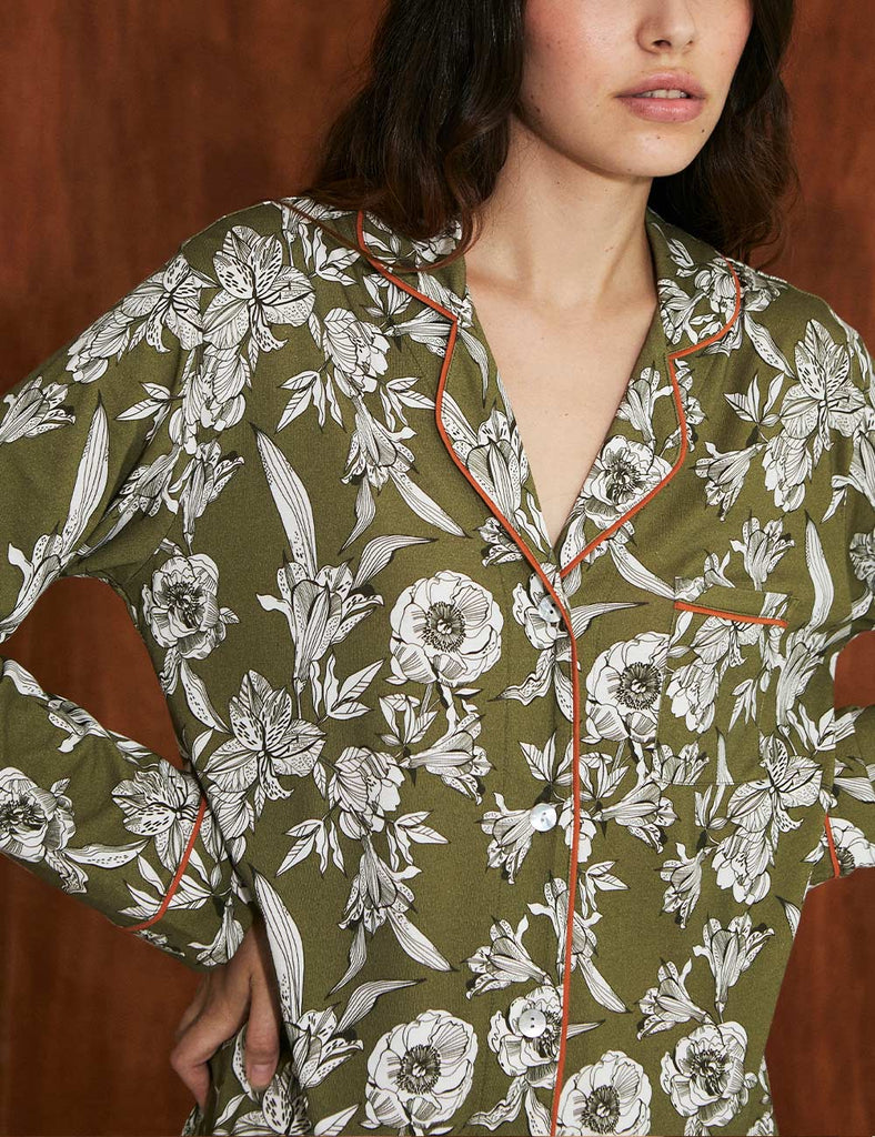 El PJ Boyfriend Vera Olive Garden se caracteríza por la caída que asentúa la figura y brindan la comodidad que necesitas al despertar. La camisa tiene un corte recto y vivo en el bolsillo, y el pantalón se ajusta a la cintura con la elasticidad adecuada. Luxury Finish - Lavado especial que le damos a nuestras telas para un mejor tacto sobre la piel y sutil caída que te dará una sensación única.