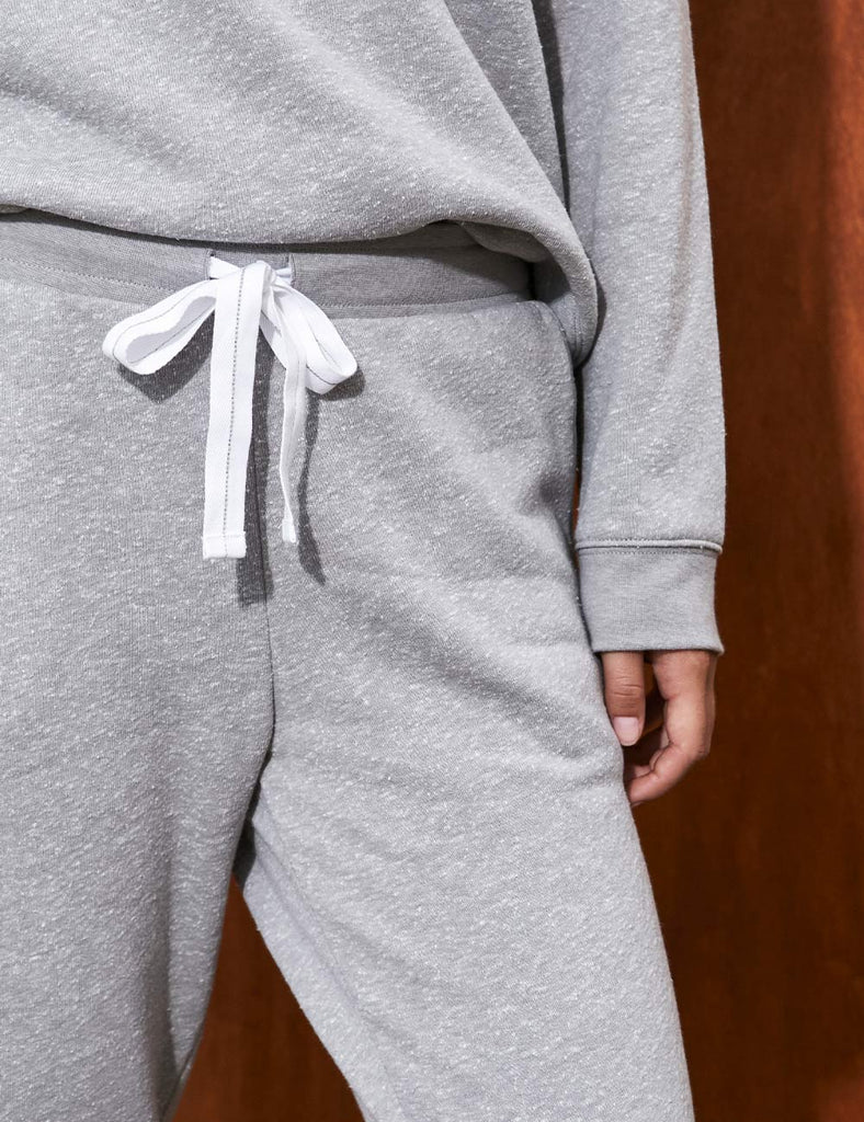 El Jogger Olimpia Gray, tiene un entalle ceñido en la cintura y en los botapiés que brinda comodidad y estructura a la vez. Está confeccionado en Cloudy Fleece: una fibra de exterior jaspeado e interior ultra afelpado que ofrece calidez ligera, suavidad y resistencia. Puedes hacer mix & match con la Sudadera Anya para completar el look o combinarlo con un básico. Disfruta de nuestros esenciales de invierno, pensados para que el frío no interrumpa tu descanso.
