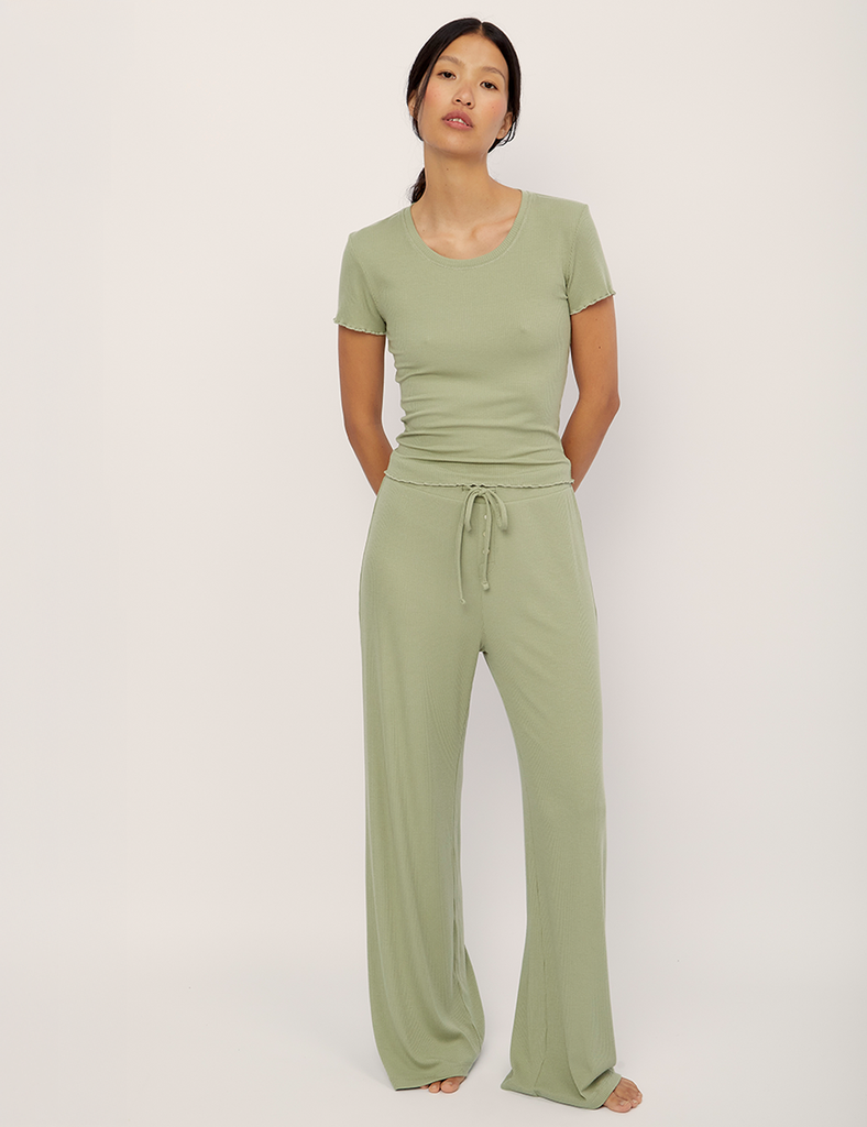El Top Cala Kiwi es un top básico de manga corta con cuello redondo, silueta entallada y detalle gurbión. Cómbinalo con el Pantalón y Short. Nuestra colección Loungewear está diseñada para acompañarte durante el día o la noche en momento íntimos contigo misma en casa. Hecho en un ligero y súper suave jersey de Modal Lenzing™, una fibra proveniente de la pulpa de madera de bosques certificados por FSC.