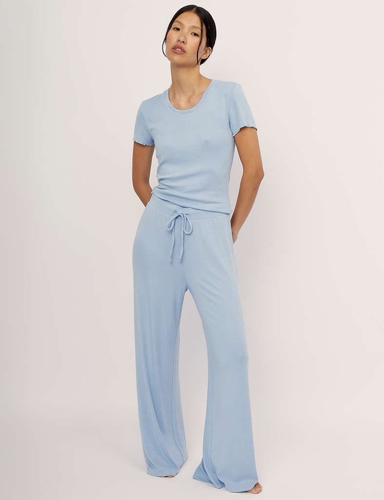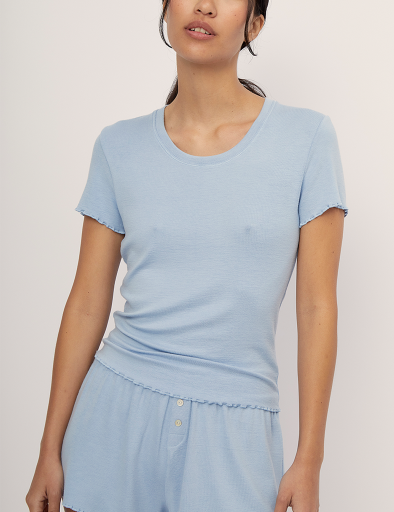 El Top Cala Morning Sky es un top básico de manga corta con cuello redondo, silueta entallada y detalle gurbión. Cómbinalo con el Pantalón y Short. Nuestra colección Loungewear está diseñada para acompañarte durante el día o la noche en momento íntimos contigo misma en casa. Hecho en un ligero y súper suave jersey de Modal Lenzing™, una fibra proveniente de la pulpa de madera de bosques certificados por FSC.